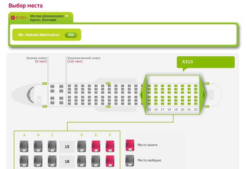 - Далее появляется схема салона лайнера. Выбирайте нужное вам свободное место.